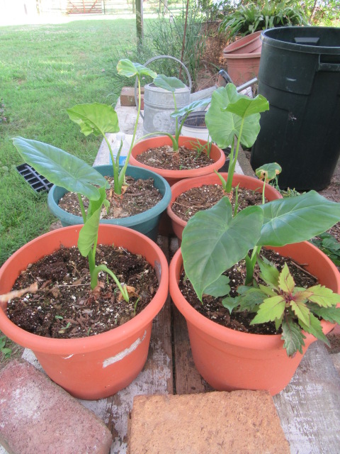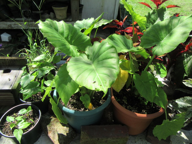 This photo was taken on 8-23-17, when I repotted the Alocasia ‘Calidora’. There are now 25 Alocasia odora, including the new babies in the larger pots.