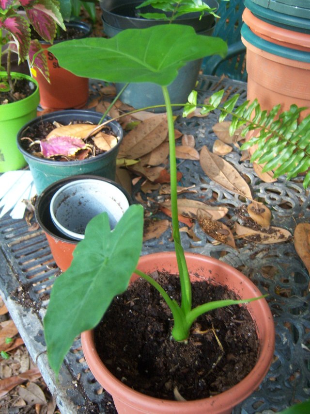 One of her plants was this HUGE Philodendron bipinnatifidum in this HUGE pot. In 2012, I think, I noticed these little plants coming up. They looked like Alocasia because of their leaves and they pointed upward. At first I thought maybe they were babies of Philodendron and the leaves would eventually change… But, that didn’t happen. I asked Tarlei and showed them when they came for a visit. She had no clue and and she said she never had any Alocasia.
