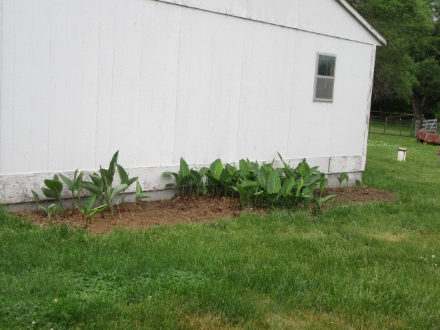 Now, this spring was strange and a lot of plants were slower to come up. I decided I would go ahead and start digging to extend the Canna bed. When I first started I noticed that they weren’t so thick. So many of the tubers didn’t even sprout but that hadn’t rotted either. In the above photo taken on May 14, I had dug the entire bed and put a few on each end. I had a plan but…
