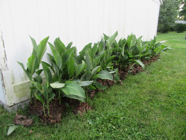Dad mentioned he would like the Cannas along the side of the garage and I thought that was a great idea. Funny, but I had also been thinking the same thing. So, in the spring of 2015, I dug a new bed and but the Cannas along the side of the garage. I know I planted them a little to close together but the bed was already twice the size as where they were. Of course, dad mentioned they were to close together. 🙂