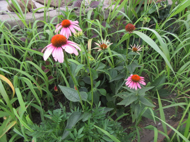 The Echinacea purpurea (Purple Coneflower) I moved here from the bed down the street this spring are now flowering. The foxtail needs pulled out of the bed AGAIN…
