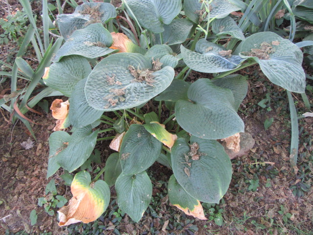 Hosta ‘Potomac Pride’ is to busy strutting right now but would prefer the leaves from the trees would fall somewhere else.