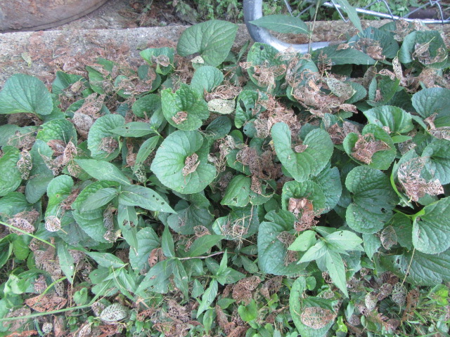 The patch of Violas along the shed covered with leaves. It was worse than this a day or so earlier but the wind blew some of the leaves off.