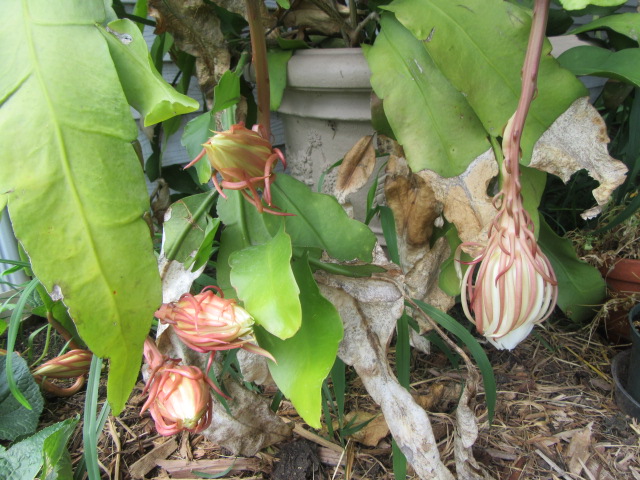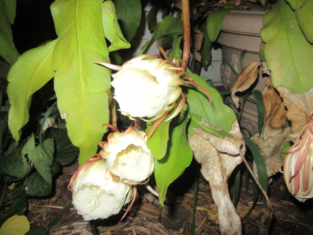 So, I went later and found they had returned home. We went to look at the Night Blooming Cereus to see what they looked like. The above photo was taken at 9:49 PM. We went inside and visited for a while then at about 10:40 she went outside to check.