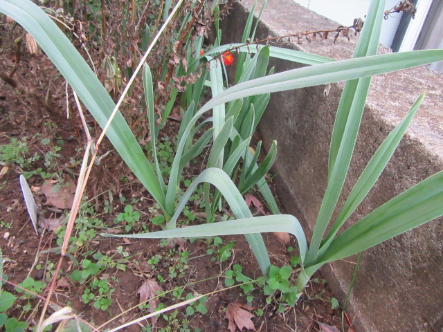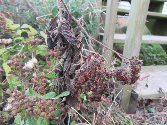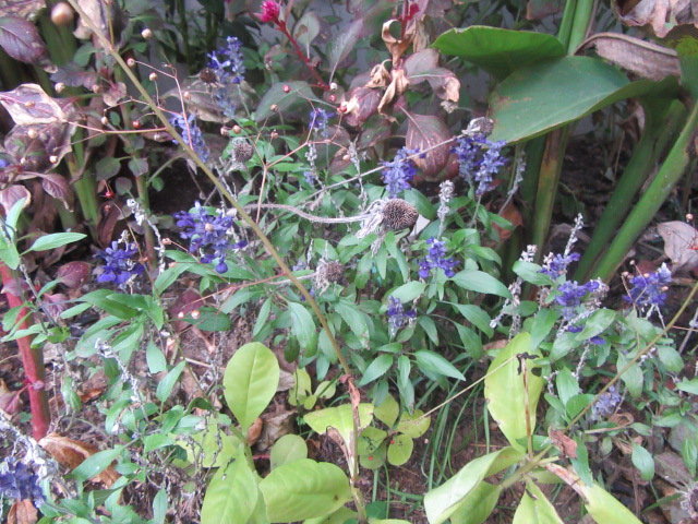 The Conoclinum coelestinum (Hardy Ageratum, etc.) in this bed are still green and lively although their flowers don’t look so hot. I hope they reseed for next year and come up a little earlier this time… Maybe I should save some seed because I would hate to completely lose these plants. Dad got his start from Aunt Inez (his mother’s sister) many, many years ago. Last winter was very hard on them…
