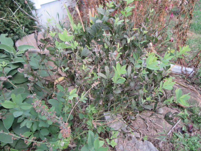 The Baptisia ‘Lunar Eclipse’ which turned out not to be a ‘Lunar Eclipse’ thinks its time to grow new leaves. I sheared it a while back to give the Phlomis more sun because it was getting carried away. Maybe this coming spring it will decide to be a ‘Lunar Eclipse’ after all…