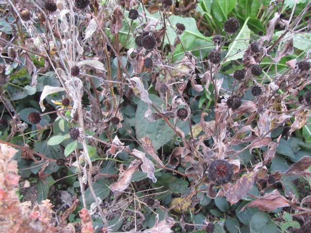 This is the northeast corner bed next to the old foundation in “the other yard”. The rhubarb completely went dormant after the “F” but the horseradish is looking great! I didn’t deadhead the Rudbeckia hirta (the wildflower) or Rudbeckia fulgida ‘Goldsturm’. The Rudbeckia hirta will spread by seed while R. fulgida ‘Goldsturm’ seems only to spread by rhizomes. They need to be spread out more this coming spring…