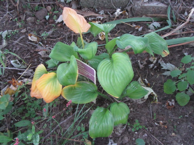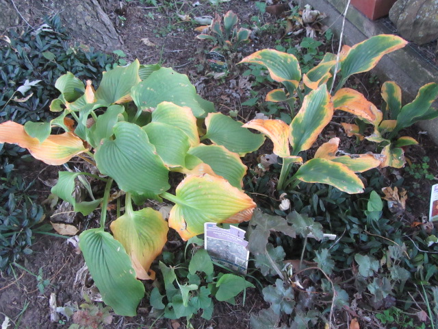 Hosta ‘Krossa Regal’ (right) almost looks variegated now. H. ‘Dancing Queen’ doesn’t look like a gold Hosta when the temps get cooler because its leaves turn green. I forgot to take a good photo of the new Hosta ‘Blue Angel’ (in the background). I am hoping it survives the winter and proves to me it really is a Hosta ‘Blue Angel’. As I mentioned in an earlier post, Hosta ‘Blue Angel’ should be a large plant but this clump looks more like some miniature cultivar. If it doesn’t grow like it should next spring, then it definitely is NOT a ‘Blue Angel’. It is possible Mast’s supplier used a growth retardant but I can’t imagine why they would do that with a Hosta unless they didn’t ant to put them in a larger pot…