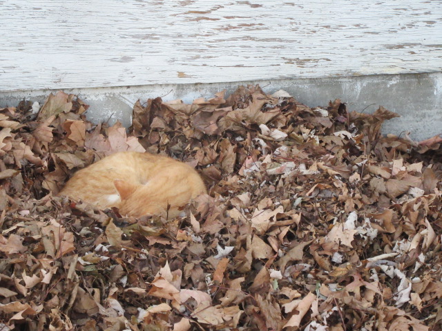 The cats always enjoy sleeping on the pile of leaves especially when it is cold and sunny. This cat has been known to sleep in some very strange places, though. He even likes to get in small boxes and flower pots just barely big enough to curl up in.