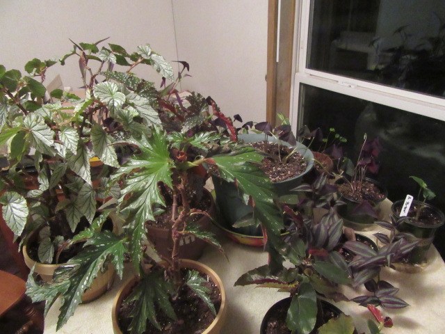 Umm… Almost every plant on this table should be in the basement. Last year the Oxalis went dormant before I even brought the plants inside for the winter but this year they have not gone dormant yet. I guess I am going to have to take them to the basement anyway. The Begonias can also be in the basement but they look so good where I can mingle with them once in a while. The Begonias on the table have hardly lost any leaves since I brought them inside. They have pretty much been on the dining room table except for a few days last month. I put them on the table in the front bedroom Tuesday evening after I gave them water.