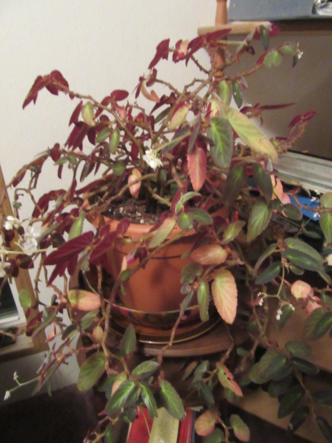 The Begonia withlacoochee ‘Brazilian Lady’ always loses a lot of leaves when I bring it inside. That’s OK, though. It will be fine. One winter it went completely dormant and came back in the spring. Well, I guess a change is in order for the name of this plant. While it is available under the name Begonia ‘Brazilian Lady’, I just found out the registered cultivar name with the American Begonia Society is ‘Withlacoochee’ (ABS #765) and it IS definitely this cultivar. ‘Brazilian Lady’ IS NOT a registered cultivar. It was registered as Begonia ‘Withlacoochee’ by someone named Michelson in 1977. Someone came up the hybrid name Begonia withlacoochee and was even listed as such in the Encyclopedia of Life (EOL). Click on that link now and it will say “server error”… The cultivar is a cross between two unidentified species, one being an unidentified “Brazilian” species… So, now I have to work on the plant’s page to the right. >