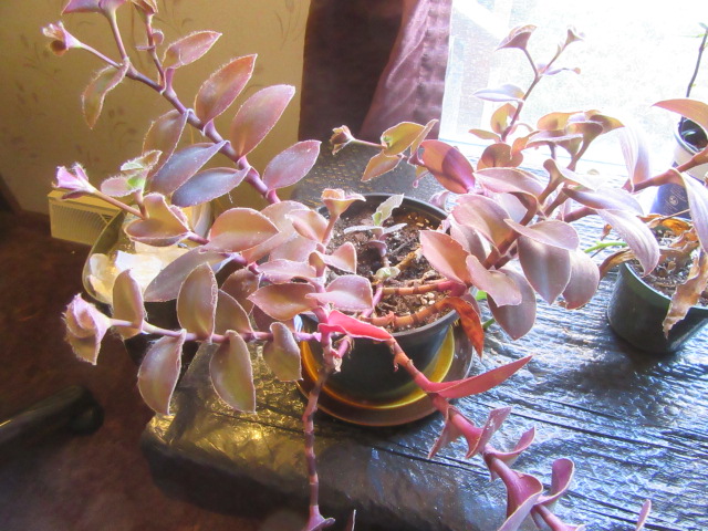 Well, the table in the other bedroom is experimental. I had the Callisia fragrans and Tradescantia sillamontana on this chest but grew tired of that. The Tradescantia needs to be in the basement so they can go dormant. Tuesday evening I moved the Callisia and Tradescantia sillamontana and put a few other plants here. This spot only gets good sun in the afternoon so a lot of plants won’t do well here over the winter.