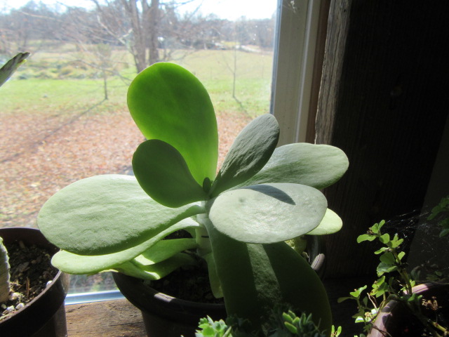 There are several Kalanchoe luciae on the shelf, but this one looks the best. When I see its leaves start to wrinkle I know it needs a little water. Otherwise, no water for the succulents during the winter…