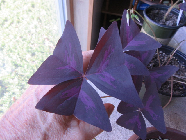 Ummmmmm… How’s that for a neat leaf? The Oxalis triangularis subsp. papilionaceae grow these impressive leaves. The color and size… Maybe I should keep this one upstairs for a while longer. 🙂