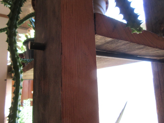 The new shelf I made for the south window is working out very well. I used boards from the loft in the barn. I made it similar to the one I made in Mississippi for the kitchen window (out of old Cypress boards).