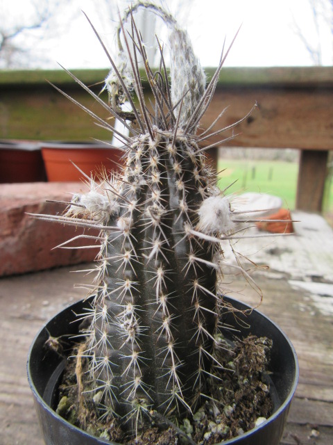 I thought this Echinopsis mirabilis was a strange looking creature that needed a new home. I think the very dark green color and its odd fuzzy appendages are what caught my eye right off. In a world of cactus where so many look alike, this one is definitely weird.