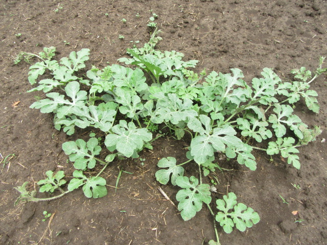 Then, a friend had issues with rabbits and deer eating his green beans, so I volunteered to pant a row of green beans. That left about 12′ for the watermelons… At first that seemed OK because the watermelons grew very slowly. Then, as the weather became warmer, they took off. I begin to wonder about my sanity. I figured when the watermelon vines got close to the other rows I could just turn them or MAYBE cut the vines and I could keep them from sprawling over the entire garden. Then I got to wondering about pruning…