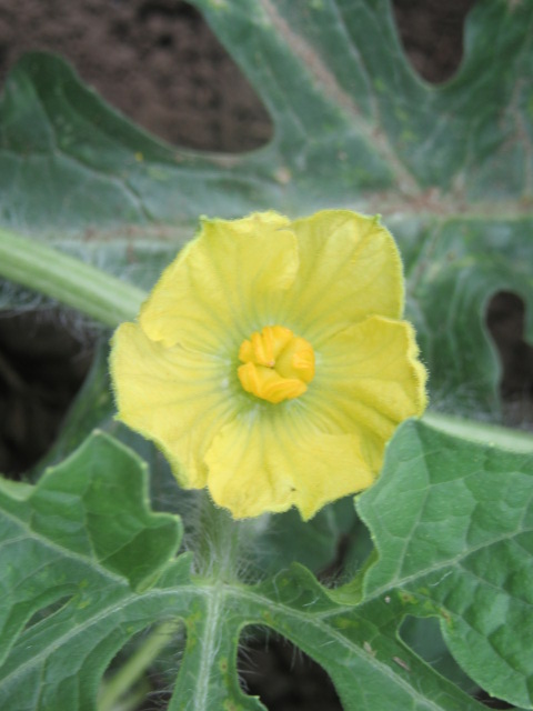 By the time I started pruning my watermelon vines they had almost reached the rows on both sides. LUCKILY, the main vines had just started flowering when I began pruning and I could get somewhat inside the patch to remove the side branches. Now, you have to realize only 1 out of 7 flowers will be female and produce a melon. This kind of complicates things and I started looking at the flowers to see if there was a difference between male and female flowers.