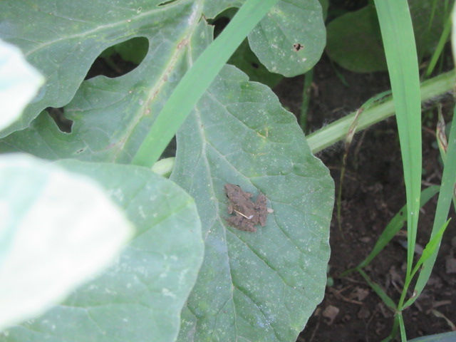 As I work in the watermelons I see baby frog and toads. The leaves provide a lot of shade and even though it hadn’t rained for a while the soil under the leaves was still fairly damp. It was strange having worms on the tomatoes, kale having their pests, Asparagus Beetles on the asparagus, Corn Earworms and other bugs on the sweet corn but no critter issues with the watermelon vines…