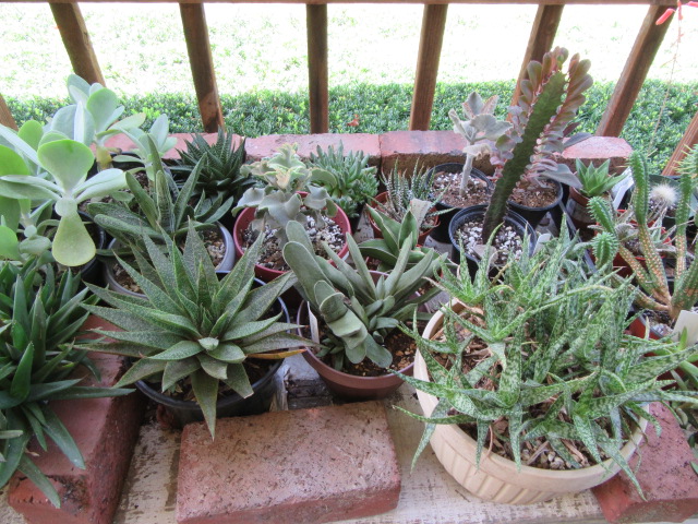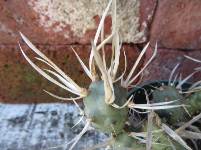 This is the most recent photo of the cactus on the back porch. I had switched places with the Mammillaria vetula subsp. gracilis and the Oscularia deltoides.