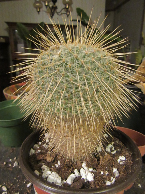 I bought this cactus from Lowe’s on April 23, 2017, making it my newest Mammillaria. I guess I didn’t measure it then, but it now stands 4 1/2″ tall x 3 1/2″ wide.