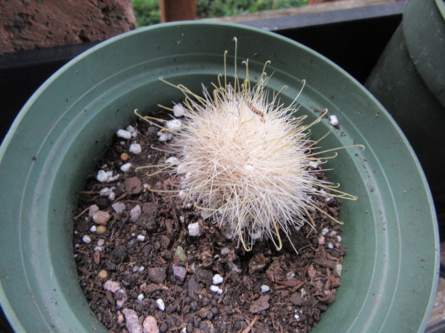The LLIFLE (Encyclopedia of Living Forms) website says, “Mammillaria elongata is a succulent ground cover, forming with time tight clumps of erect, ascending, prostrate or recumbent stems. This may be the most common Mammillaria to be found and occurs in more variations than any other Mammillaria species. It commonly comes in many color and spine variations.” Information also says they need the highest light level possible (without burning) to encourage heavy spine formation… Well, it is definitely getting plenty of sun on the back porch. 🙂