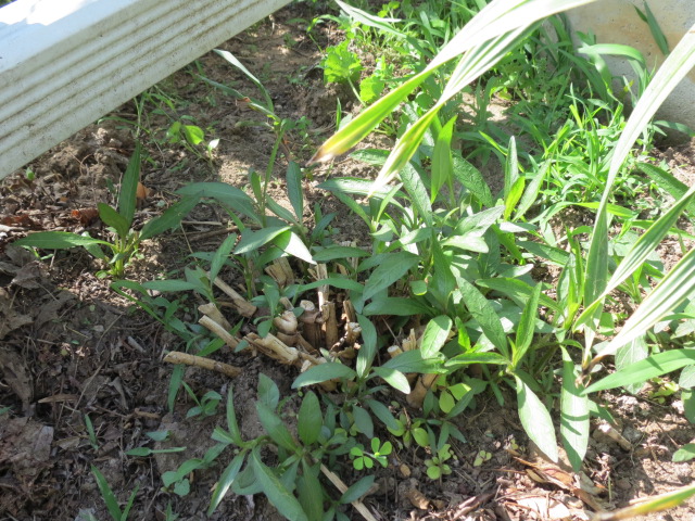 I was somewhat prepared, though… Knowing the Ruellia simplex wasn’t cold-hardy here, USDA zone 6, I had already dug several pots and put them in the shed. I left the one clump in the south bed to see what would happen. Umm… I am writing this page on March 14, 2018, and I am a bit confused… I thought I brought three pots from Mississippi and there seem to be four or five pots in this photo. Hmmm… Maybe some of the clumps were too big for one pot.