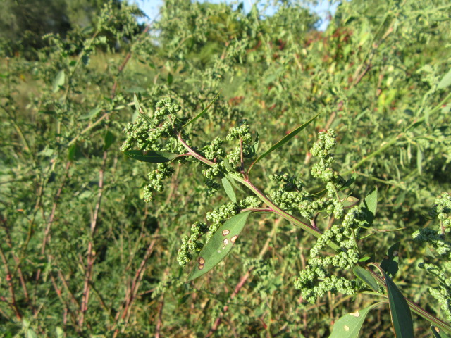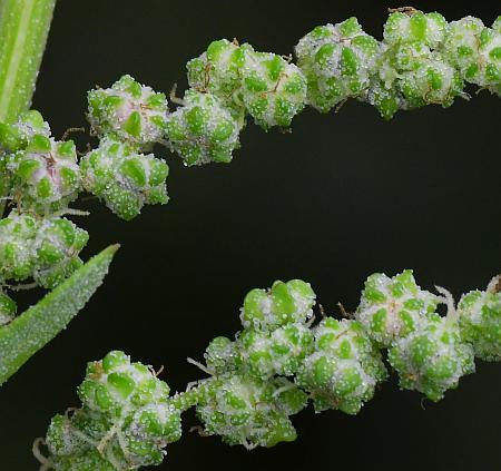 The small yellowish-green flowers are about 1/10” across and have a white-mealy coating. They have a 5-lobed broadly keeled calyx that persists at fruiting, no petals, 5 stamens with yellow anthers, a 2-3 parted style, and 2 stigmas. Flowers are produced from May through sometime in October in my neck of the woods in west-central Missouri. The flowers are wind-pollinated.