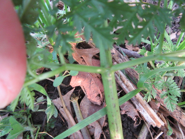 I have been seeing the Conium maculatum growing along the highways and backroads for several years but never stopped to take photographs. Mainly because I didn’t have my camera and I don’t have a cell phone. Then on April 29 in 2022, I was mushroom hunting along the fence (actually across the fence) when I spotted a small plant that looked suspicious that had been mowed off and grown back. I had my camera so I took several photos and uploaded them on iNaturalist. Sure enough, it was a Conium maculatum…