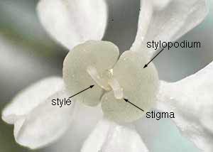 On top of the ovary and base of the style is a flat-like stylopodium which some sites refer to as a “landing pad” for insects.
