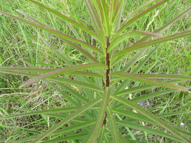Asclepias hirtella can be distinguished from other Milkweed species by its long, narrow leaves that grow alternately along the stems rather than opposite like other Milkweeds. Flowers are greenish-white and lack “horns” in the hoods of the flowers. Asclepias hirtella produces more umbels per plant than most other Milkweed species…