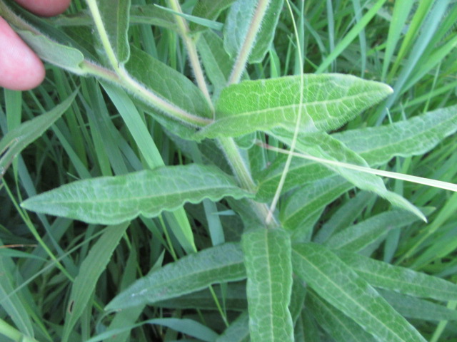 This is one of a few Asclepias species that grow leaves in an alternate manner rather than having opposite pairs along the stem. Leaves are said to be linear-oblong, lanceolate, to lanceolate-oblong in shape, 2 1/2-3 1/‘“ long x 1/2-3/4” across. The tips of the leaves are pointed (acute) while the base is rounded and sort of folds under (revolute). Leaves are toothless and either have short petioles (leaf stems) or may be sessile (no petioles). The upper leaf surface is medium to dark green, either smooth (glabrous) or have short hairs (pubescent).