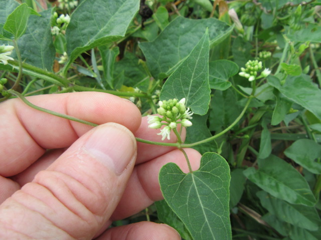 The vines grow from a root system consisting of a taproot and long rhizomes. The vines can grow fairly long, at least 20’ or more, are light green to reddish green, and can have longitudinal lines of hairs (especially toward the tips). Vines can be hard to eradicate because plants can grow from the roots left behind when pulling them up. The stems produce a clear to cloudy toxic latex sap, so it is best to use gloves if you pull them up and avoid skin and eye contact.