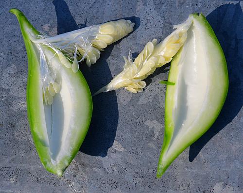 If pollinated, the flowers produce fruit called a follicle. The follicles are about 4” long and 1” across and splits open once it dries and turns brown. The seeds have large tufts of hair that carry them through the wind.