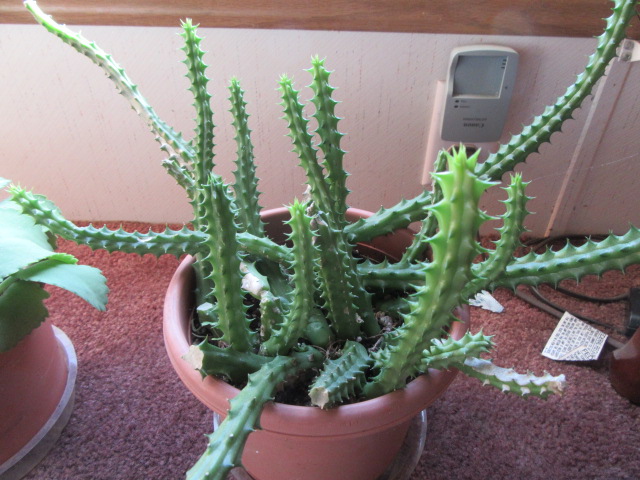 My son with 3 large cats were here when I moved the plants inside, so many of them had to be put in the basement temporarily (with a light on). Most of the plants did fine for the few days they were there, but this plant lost several stems. I moved it back to its normal wintertime spot after a few days. Now I have to put the stems in a pot…