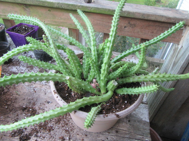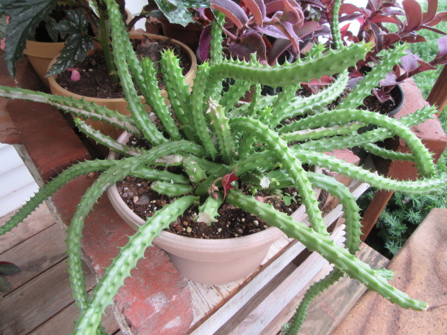 The Huernia schneideriana did very well during the summer on the front porch despite the heat and drought. It looks about the same although it continues to produce more offsets and the stems are longer…