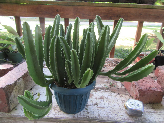I had to bring the potted plants inside for the winter on October 15 because an “F” was in the forecast. As always, I take photos and measurements as I move them inside. I measured the cactus and part of the succulents but I didn’t measure this plant. It is filling up the pot and needs a bigger one VERY soon. I didn’t have this plant in full sun over the summer but I think it received plenty of light. Perhaps I need to put it in a different location in 2021.