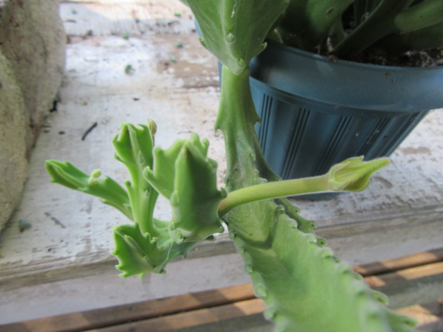 One single bud appeared I think early in September, but by the time I moved the plants inside it looked like it was drying up. Hmmmm… I cut off one of the stems that was hanging over the side when I moved the plants outside and gave it to Mrs. Wagler of Wagler’s Greenhouse. We trade a lot of plants.