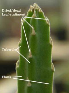 They have velvety-green, spineless stems with four ribs. The stems have tubercles that are laterally flattened and vertically joined. Each tubercle has a small rudimentary leaf which is short-lived and leaves a scar at the tip of the tubercle. The stems are considered determinate as they only grow to around 8- 12” tall (20-30 cm). Plants can spread 2-3’ wide if given a chance in pots or in the ground. If grown in pots, they will branch out and hang over the sides.