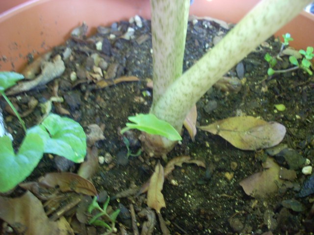 All seemed to be fine until, for no apparent reason, the Alocasia boa started declining and went completely dormant. I moved the pot next to the ‘Williams’ Banana in another area of the backyard. The next thing I knew, a new plant came up next to the dormant bulb (rhizome, tuber, whatever you want to call it). I never had an Alocasia produce an offset that soon before. The above photo is of the new offset taken on 8-12-12, #115-7.