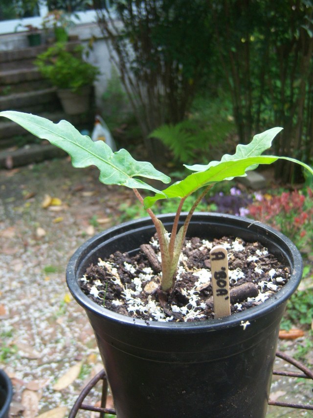 I bought my Alocasia boa from Wellspring Gardens in the spring of 2012 as a starter plant. I liked its narrow arrow-shaped ruffled leaves and speckled petioles.