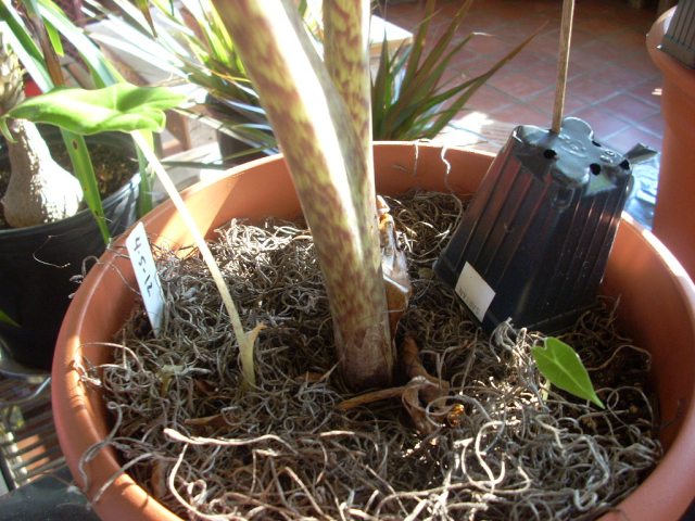 I must admit Alocasia ‘Sarian’ has been a challenge. Experience has taught me a few things about Alocasia and that is that some species and hybrids go dormant very easily. Of course, ‘Sarian’ did it AGAIN. The photo above was taken on 7-12-14 (#231-10). Although it did come up in 2014, it remained kind of weird for the most part. The above photo was the last one I took of my Alocasia ‘Sarian’ companions.