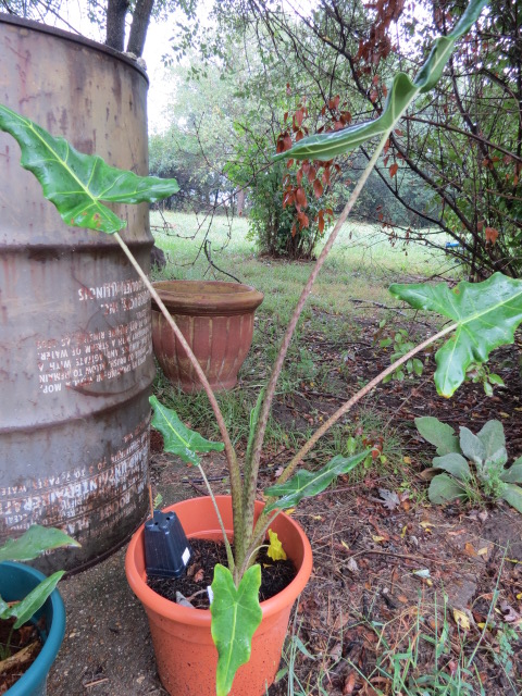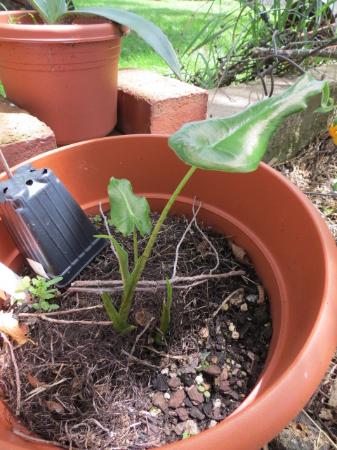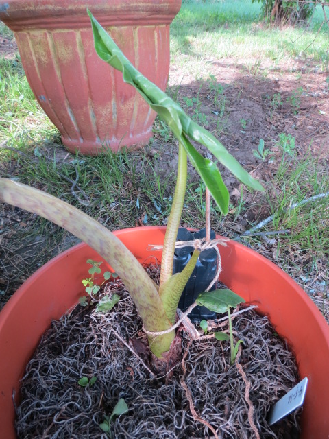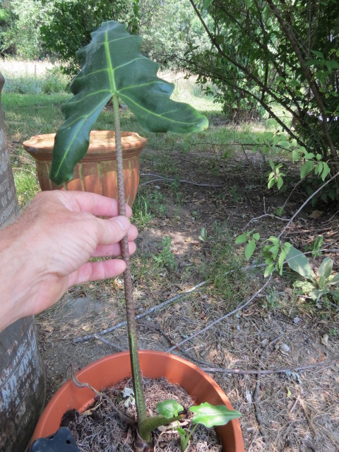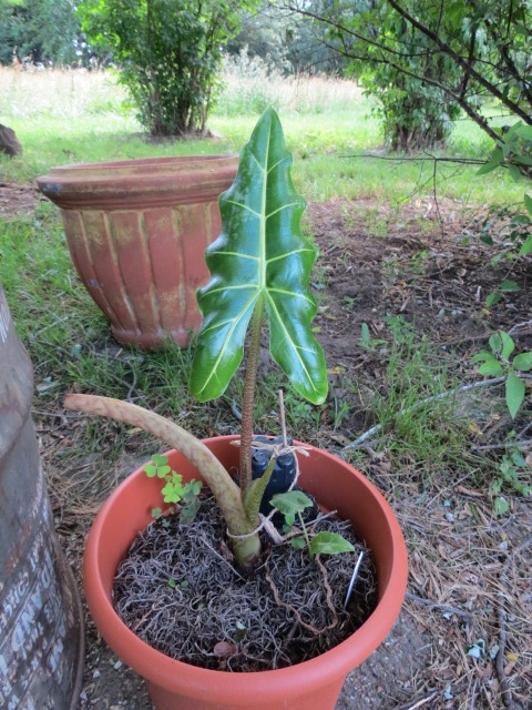 Alocasia ‘Sarian’ back in a pot on 6-11-12, #99-10.