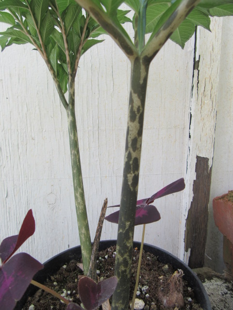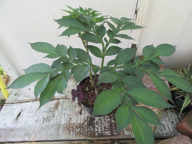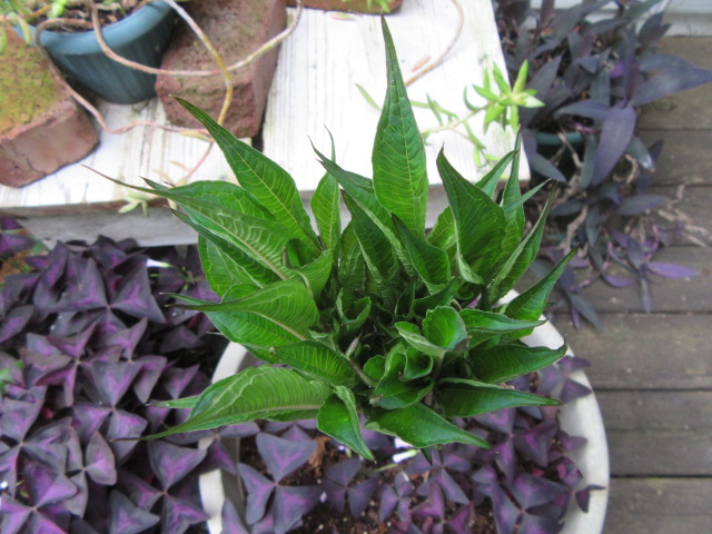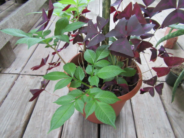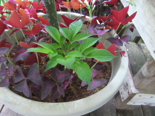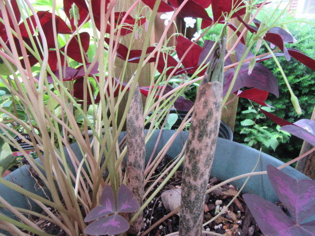 The Amorphophallus konjac in its new pot on 7-30-17, #362-2. Nice there was an Oxalis triangularis (var. papilionaceae) that came along, too.