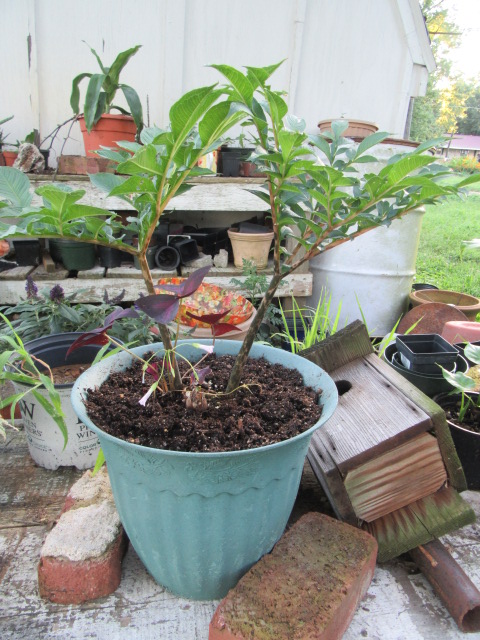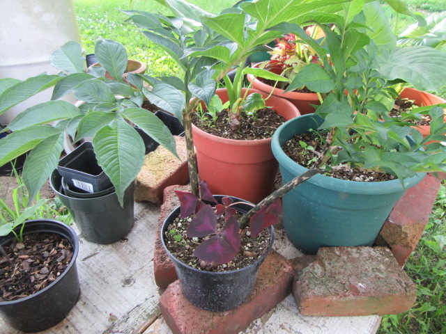 I put the bigger clump of Oxalis rhizomes in the original pot with several smaller pieces around it. I put a few in each of the bigger pots of Amorphophallus just because they really do look good together. Even though the Oxalis will need watering sooner than the Amorphophallus, there is such a difference in their depths it will be OK. I just don’t want to soak the pot… Mrs. Wagler said she needed more Voodoo plants, so she will get the smaller pots once the plants start growing.