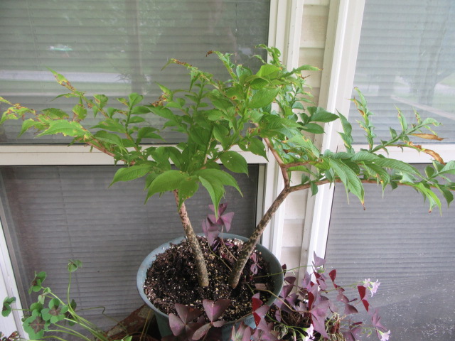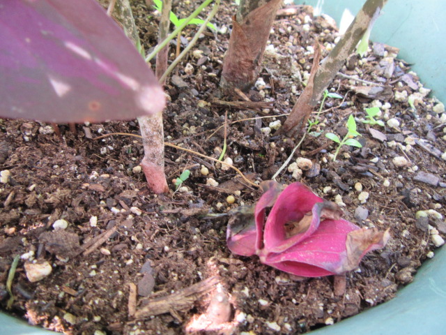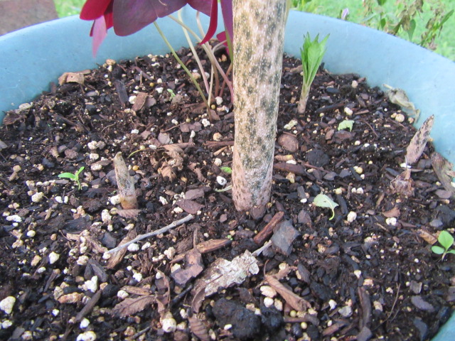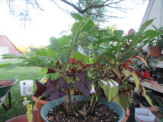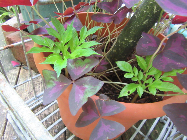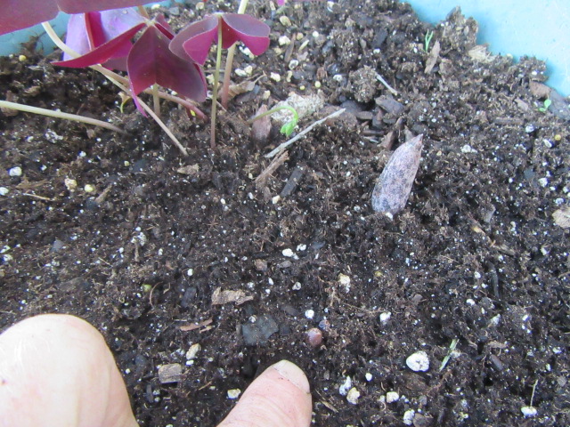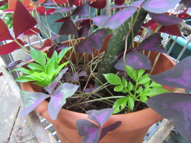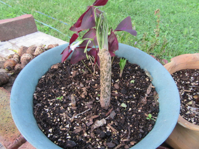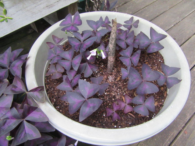 The pot had two plants growing it plus the Oxalis. There is also what appears to be an old stem of some sort in the middle of the pot.