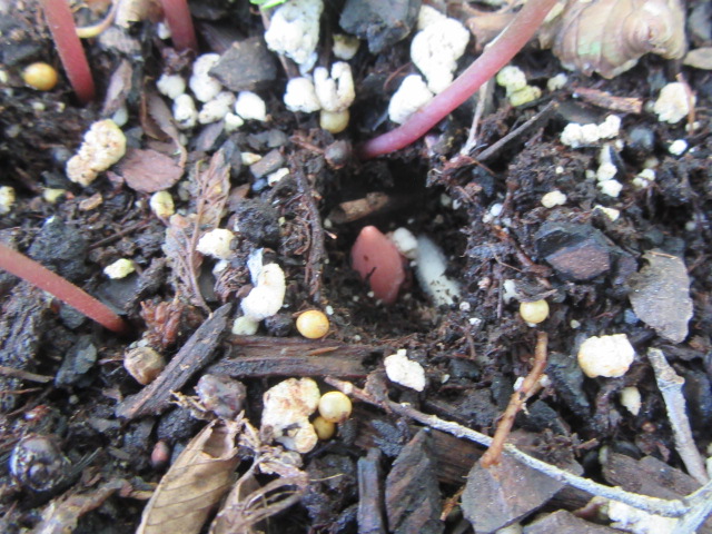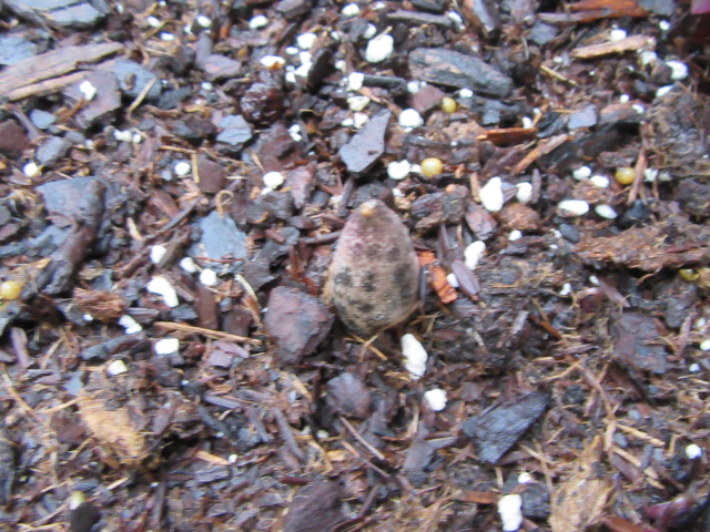 This curious-looking creature is next to the Oxalis… What do you think it is? When I first saw it before I thought maybe it was an Oxalis bulb. But I am wondering… Could it be? Maybe it is an Amorphophallus flower coming up. That would be AWESOME!