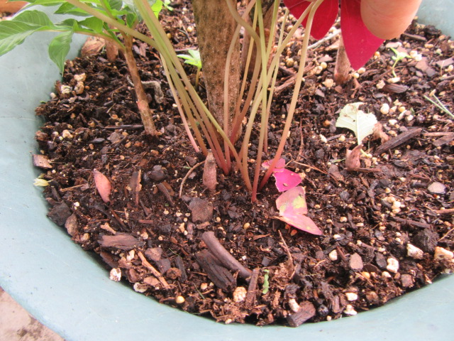 Out of curiosity, I pulled the old bulb up to have a look. Well, GEE WHIZ! It had no roots! Once I pulled the stem out I could tell the bulb that needed to be in the soil was on top. Many aroids do this. They grow a new bulb (rhizome) on top of the old one, including the Colocasia esculenta. So, I pushed the whole thing into the soil down to where the top was covered up. Hmmm. Come to think about it, the little bulb on top looks like a miniature Colocasia esculenta bulb. I wonder how old that stem is?