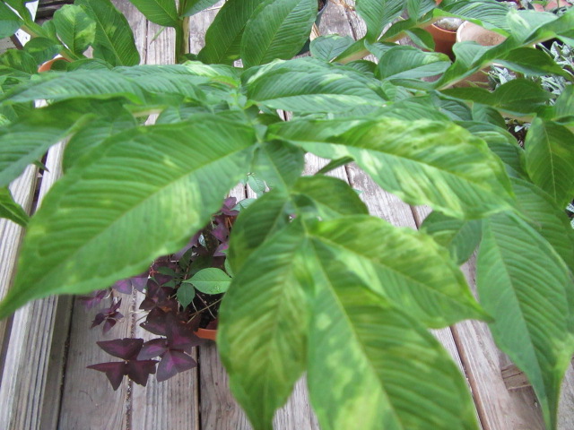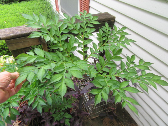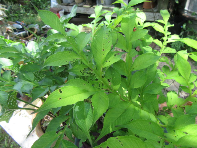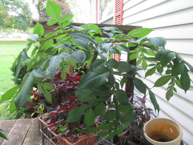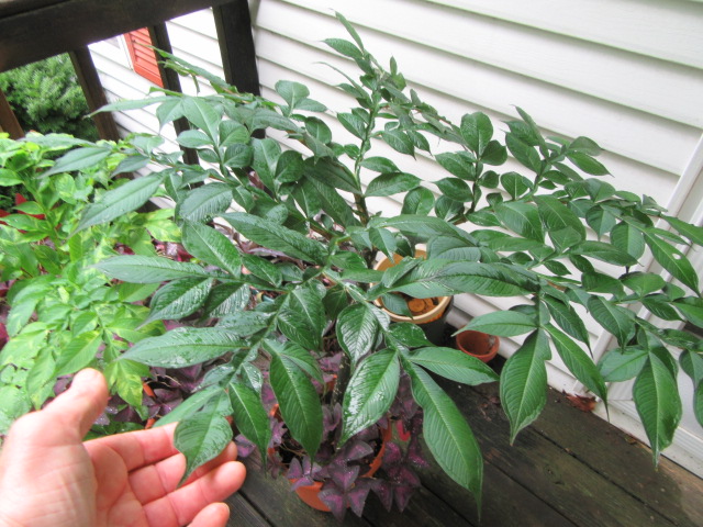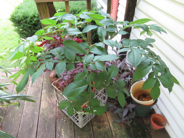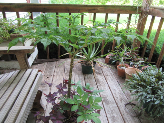 On July 2 I decided enough was enough and moved the Amorphophallus and Calla to the side porch. Not only were the Japanese Beetles chewing on the other plants now, but the light to part shade area behind the shed had also pretty much turned into full sun.