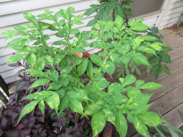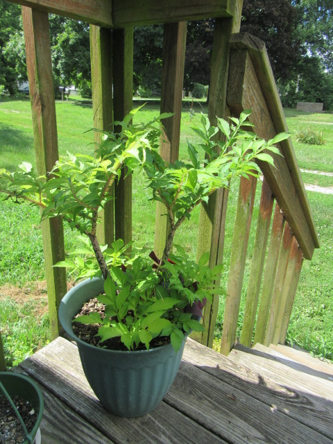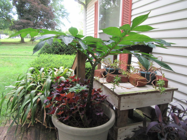I started to have a worse problem with the Japanese Beetles. Not only were they eating the leaves on the Chinese Elm tree, but they also started munching on the Amorphophallus and pot of Calla next to it. I should have taken photos before I chased them away. Hmmm… Now, in this photo, there are two big plants…